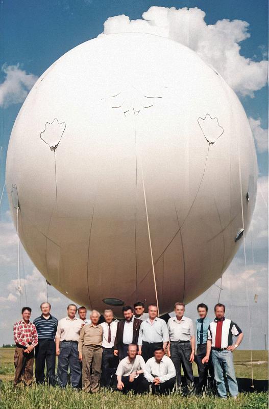 Экспериментальный аэростатный радиолокационный комплекс «Кредо-1» на базе привязного аэростата УАН-400, его создатели и испытатели, стоят: 3-й справа Баранов В.Л., 6-й справа – главный конструктор аэростатной части Федоров С.В., 7-й справа – заместитель директора ФГУП НИИ «Стрела» (разработчик РЛС) по науке Супоровский М.П., 9-й справа – конструктор аэростата Щербаков Ю.В., 1-й слева Павлушенко М.И., сидит 1-й слева конструктор аэростата Морозов К.П., 2000 г.