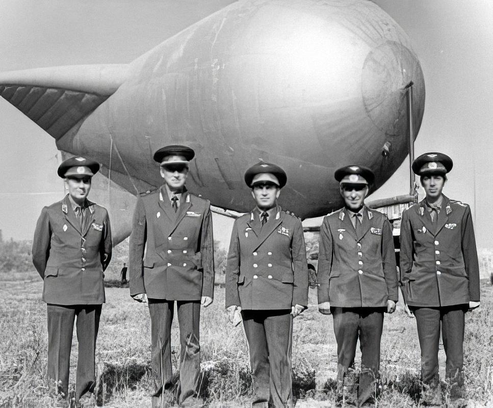 Дирижабль «Термоплан». На фото слева направо: автор теории боевого применения дирижабля генерал-майор Баранов В.Л., один из руководителей конструкторского бюро Старостин И.А., капитан Павлушенко М.И.