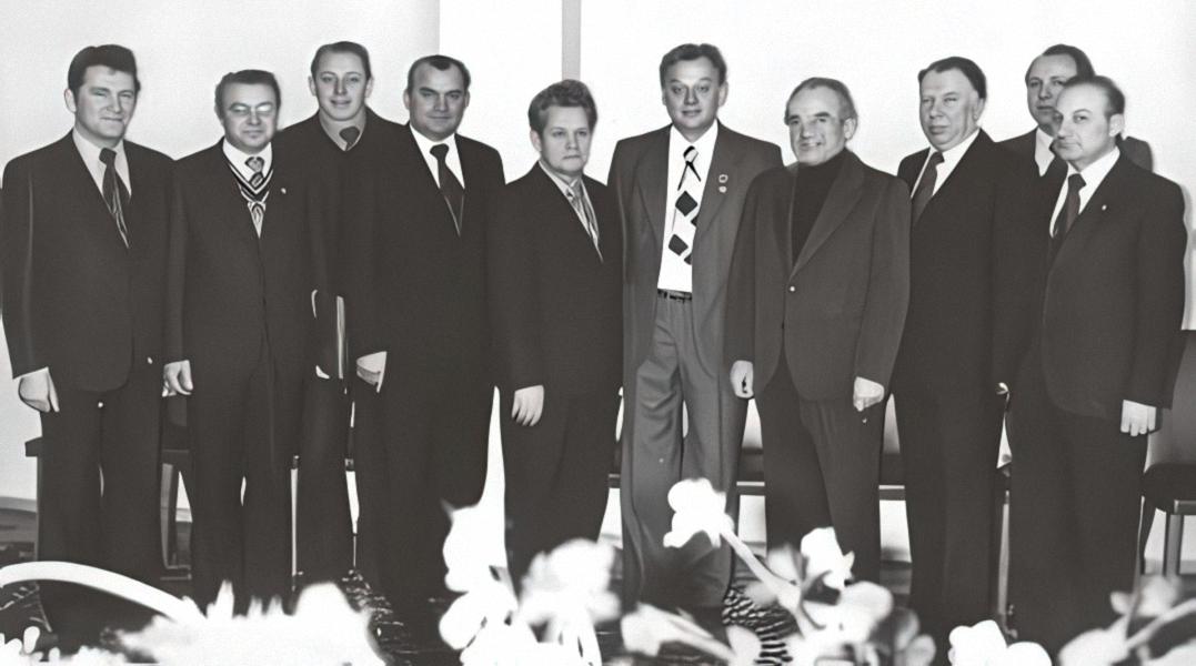 г. Днепропетровск, август 1979 года. Справа налево: генерал-полковник ГРИГОРЬЕВ М.Г. (четвертый), ГУБАНОВ Б.И.(первый заместитель начальника КБ «Южное» – пятый), генерал-майор КОВАЛЁВ И.Д.(начальник 7-го управления ГУРВО – шестой), полковник ХАЛИН В.Г. (заместитель начальника 1-го отдела 7-го управления, ведущий специалист ГУРВО по «Периметр» – десятый) и ряд представителей КБ «Южное и 227 ВПМО во главе с районным инженером полковником ВЛАДЫКО А.Ф. (третий справа)