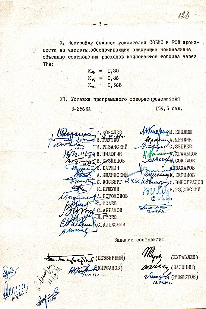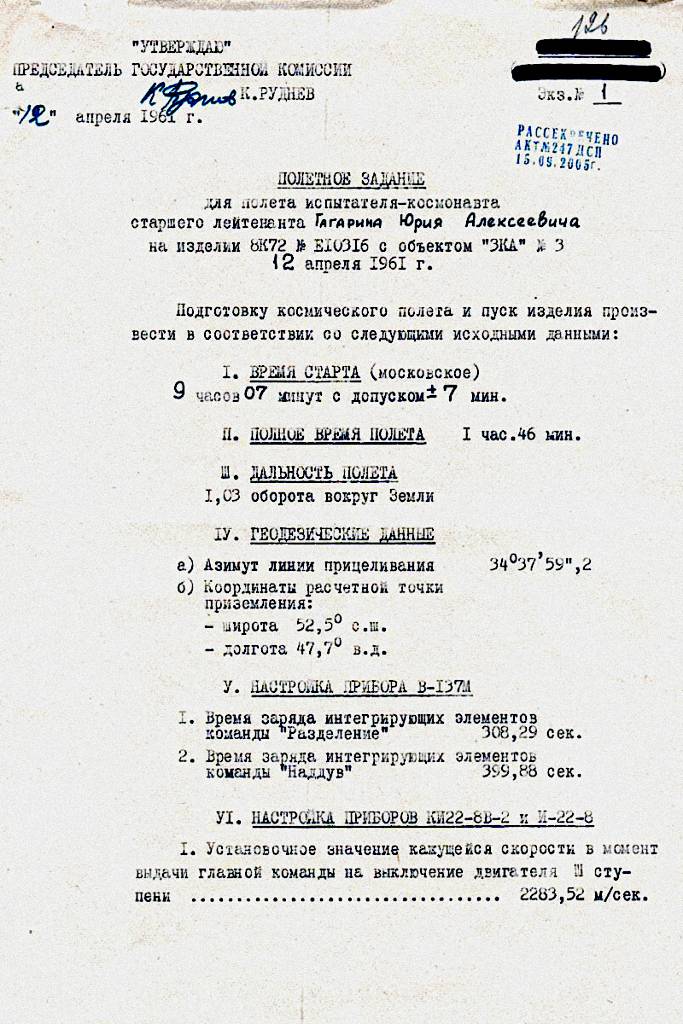 Полетное задание для полета испытателя-космонавта старшего лейтенанта Ю.А. ГАГАРИНА составили сотрудники ОКБ-1 БЕЗВЕРБЫЙ Виталий Константинович (1929–2010) и КИРСАНОВ Виталий Георгиевич (род. 1936), а также офицеры-ракетчики капитан ЖУРАВЛЕВ Вениамин Порфирьевич (1923–1985), начальник 50-й лаборатории 28-го отдела 5-го НИИП МО полковник КАЛИНИН Спартак Александрович (1924–1996) начальник 19-го отдела 5-го НИИП, капитан ЯЧЕИСТОВ Изяслав Александрович (1927–1976) офицер 1-го отдела 4-го управления ГУРВО.