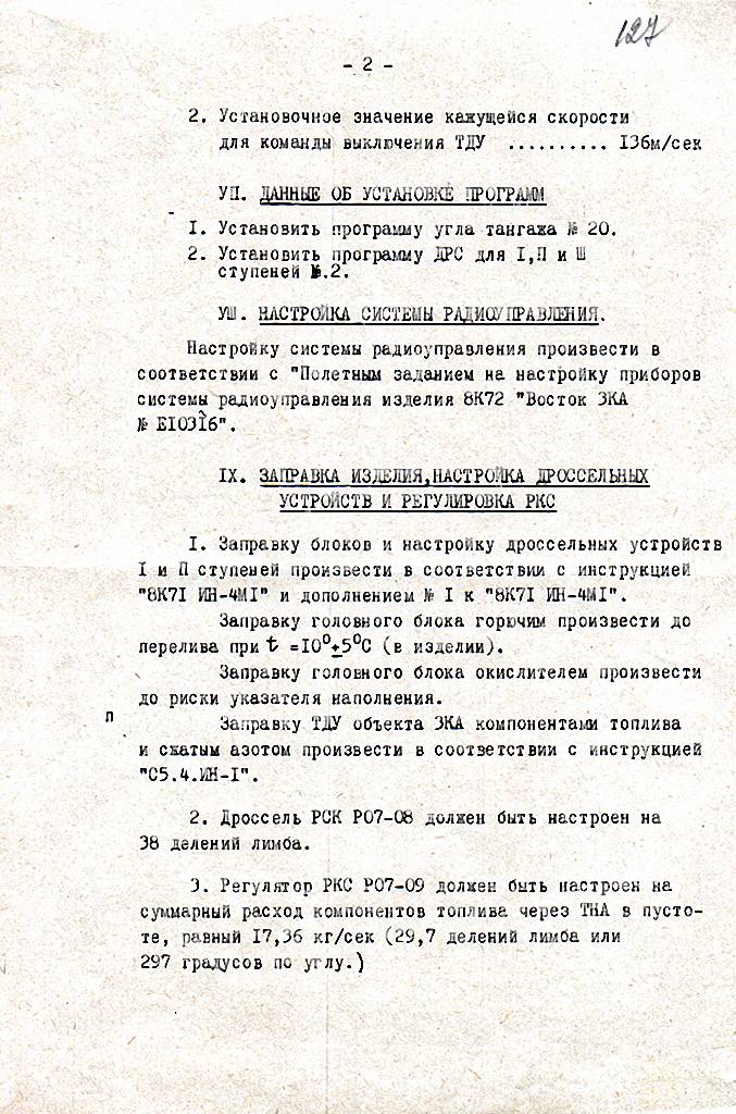 Полётное задание для полета испытателя космонавта Ю.А. ГАГАРИНА