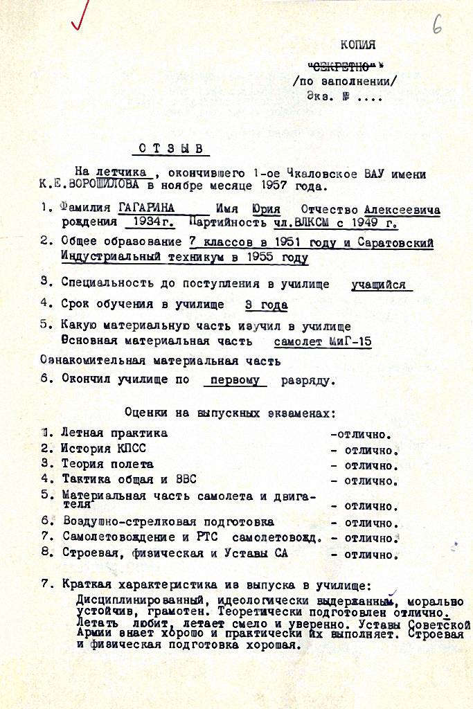 В период 17–18 января 1961 г. экзаменационная комиссия, назначенная приказом Главнокомандующего Военно-Воздушными Силами № 003 от 6.01.1961 г., провела работу по приему экзаменов от шести слушателей-космонавтов специальной группы Центра подготовки космонавтов ВВС. Слушатели-космонавты получили твердые теоретические знания и практические навыки, которые смогут использовать, как в период подготовки к космическому полету, так и в самом полете. Знания всех слушателей оценены на «отлично». Комиссией ориентировочно рекомендована следующая очередность экзаменовавшихся слушателей к первому космическому полету: ГАГАРИН Ю.А., ТИТОВ Г.С., НЕЛЮБОВ Г.Г., НИКОЛАЕВ А.Г., БЫКОВСКИЙ В.Ф., ПОПОВИЧ П.Р.